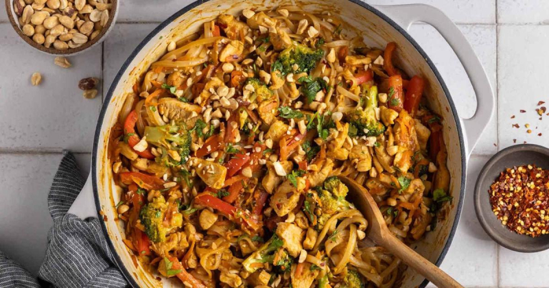 Ono što ovu tjesteninu izdvaja jeste lakoća pripreme. Iako priprema zahtijeva nešto više vremena od samog kuhanja, sve možete unaprijed organizovati: napravite umak, namočite rezance, nasjeckajte povrće i piletinu, pripremite začinsko bilje i kikiriki. Kada sve to pripremite, završetak jela ide veoma brzo.